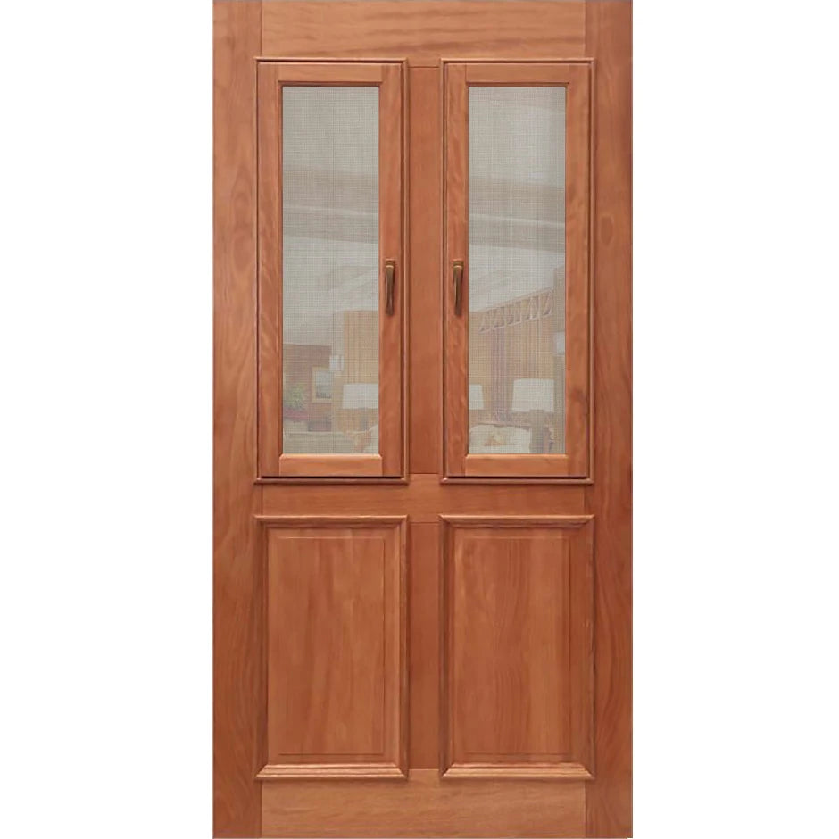 The timber window with glass is installed inside the entrance door and can be opened as a screen door when the entrance door is closed.
